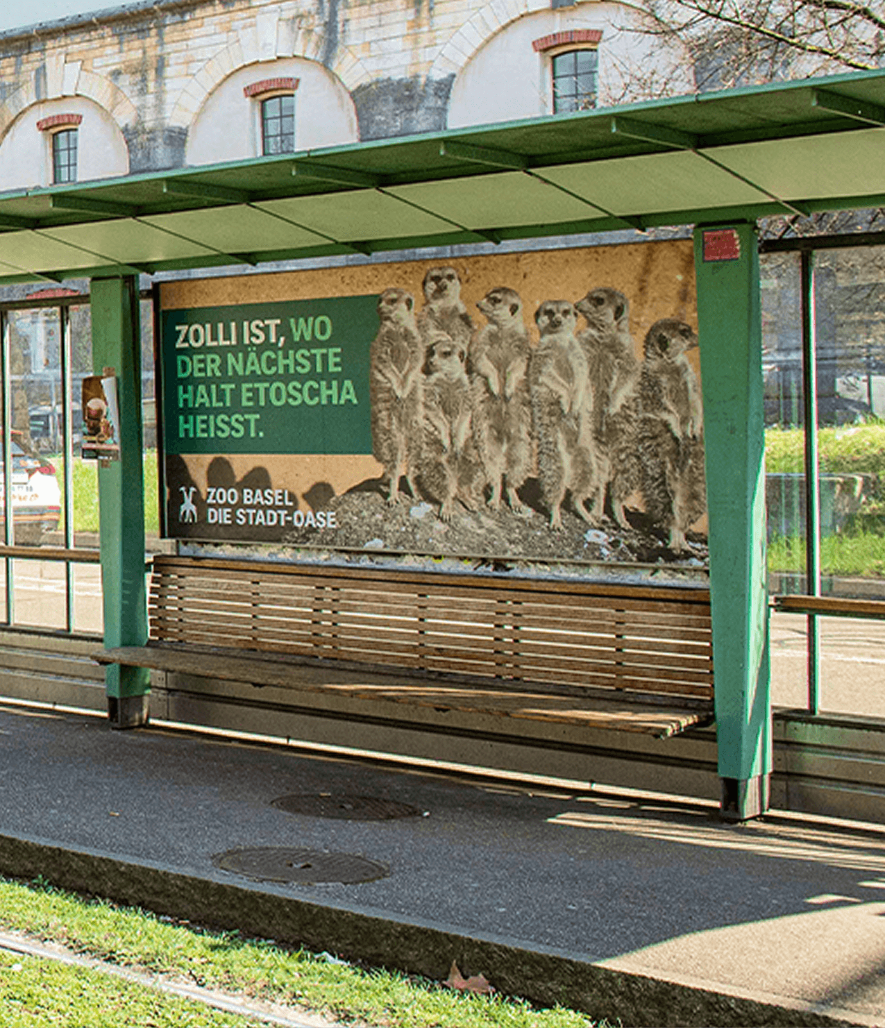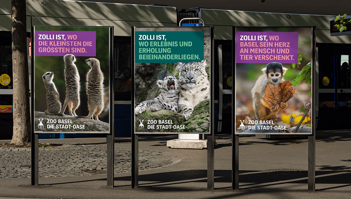 Seit 2022 betreuen wir den Zoo Basel und entwickeln die Marke mit grosser Sorgfalt weiter. Der «Zolli» ist ein emotionaler Fixpunkt der Basler Bevölkerung – mitten in der Stadt gelegen, ist er ein Ort gemeinsamer Erinnerungen, Schulreisen und Familienrituale. Aus dieser engen Verbundenheit haben wir auch den Claim «Die Stadtoase» geschöpft: eine prägnante Übersetzung dessen, was der älteste, wissenschaftlich geführte Zoo der Schweiz seit Generationen für Basel bedeutet.